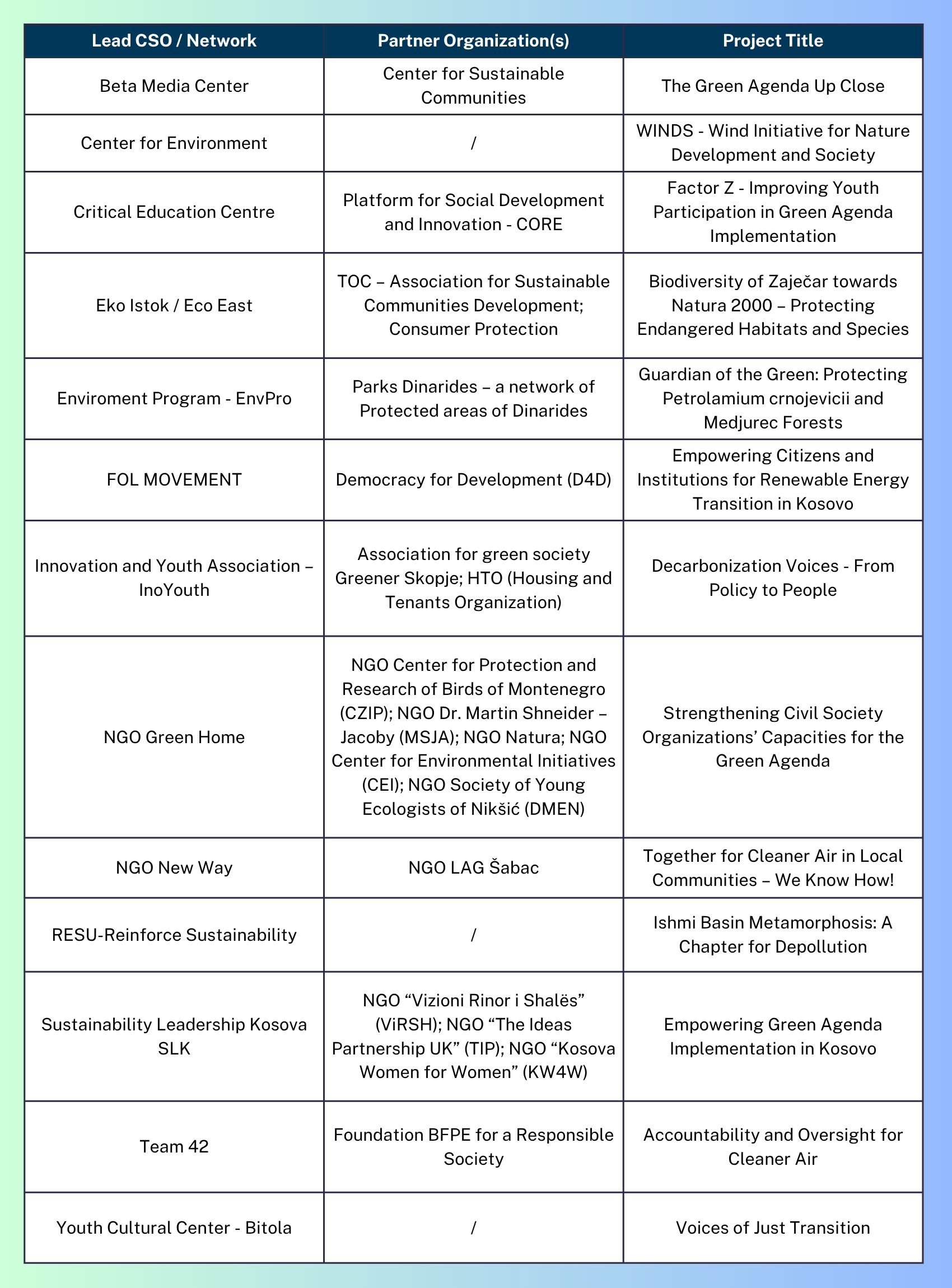 This Call was announced under the Green Agenda Navigator project, implemented by Belgrade Open School in cooperation with six regional partners: the Aarhus Centre Association in Bosnia and Herzegovina, Eco-Team from Montenegro, Eco-Z from Kosovo*, the Center for Environmental Research and Information Eko-Svest from North Macedonia, the Protection and Preservation of Natural Environment organization from Albania, and CEE Bankwatch Network as the EU-based partner. The project is co-funded by the European Union.